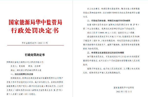 國家能源局華中監(jiān)管局12月7日公布的一則行政處罰信息顯示,國網(wǎng)湖北省電力有限公司云夢縣供電公司在用戶受電工程中存在指定設(shè)計單位、施工單位的行為,被處以罰款51萬元。