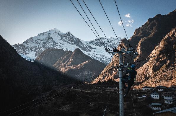 收到村民反映停電故障后,旺登一行立即開展檢查,發(fā)現(xiàn)故障出現(xiàn)在雨崩上村2號(hào)臺(tái)區(qū),且需要爬上12米高的電線桿進(jìn)行作業(yè)。只見旺登綁緊安全帶,戴上絕緣手套,踩實(shí)腳扣,并進(jìn)行簡短的沖擊試驗(yàn)。隨后,他雙手扶住桿體,左腳穩(wěn)穩(wěn)地扣住,接著右腳向上提,一步一步交叉著往上。
