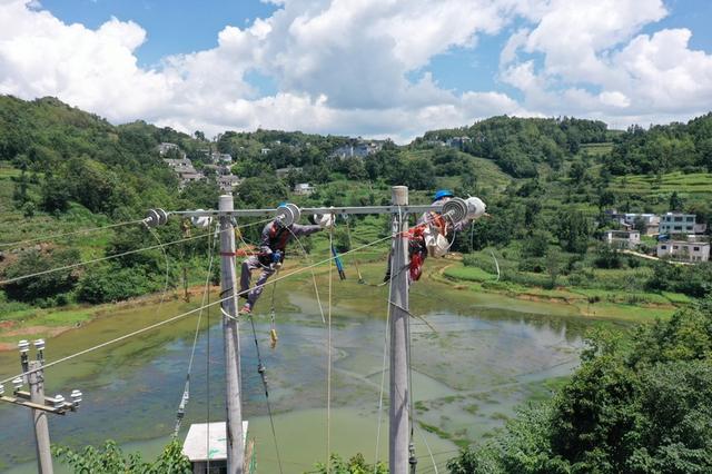 南方電網(wǎng)興仁供電局工作人員對新田水庫10千伏龍麻線新田支線線纜進(jìn)行緊線操作。