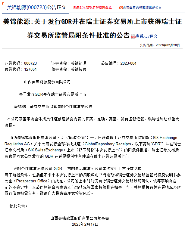 2月20日,美錦能源發(fā)布公告稱:公司于近日獲得瑞士證券交易所監(jiān)管局關(guān)于公司發(fā)行全球存托憑證(GDR)并在瑞士證券交易所上市的附條件批準(zhǔn),瑞士證券交易所監(jiān)管局同意公司發(fā)行的GDR在滿足慣例性條件后在瑞士證券交易所上市。