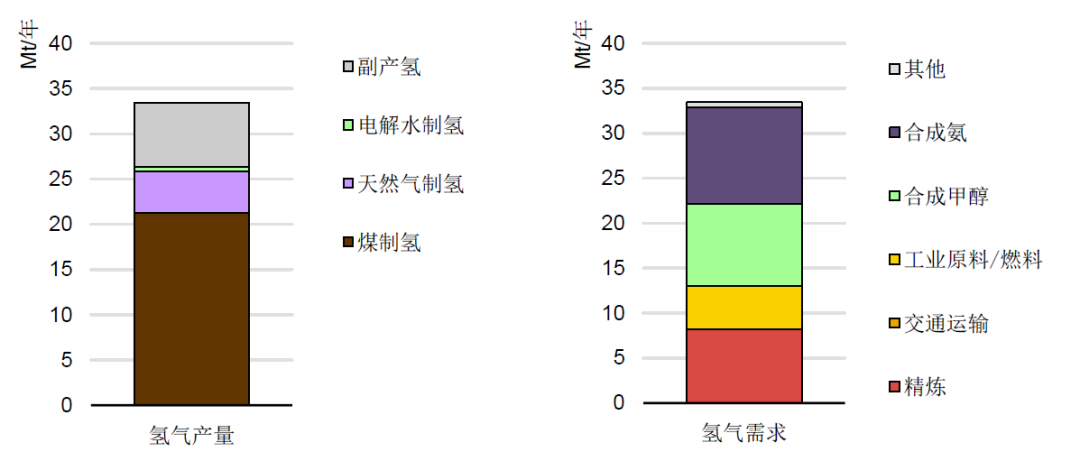 氫是重要工業(yè)原料,在合成氨、合成甲醇、石油煉化中廣泛使用,也是金屬冶煉的重要原料,廣泛用于鎢、鉬、鈷、鐵等金屬和鍺、硅的生產(chǎn)。根據(jù)國際能源署(IEA)統(tǒng)計數(shù)據(jù),中國2020年氫氣生產(chǎn)和消費量約3300萬噸,生產(chǎn)方面絕大多數(shù)來自于煤、天然氣等化石能源,消費方面主要是合成氨、合成甲醇、石油煉化等。
