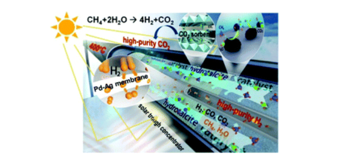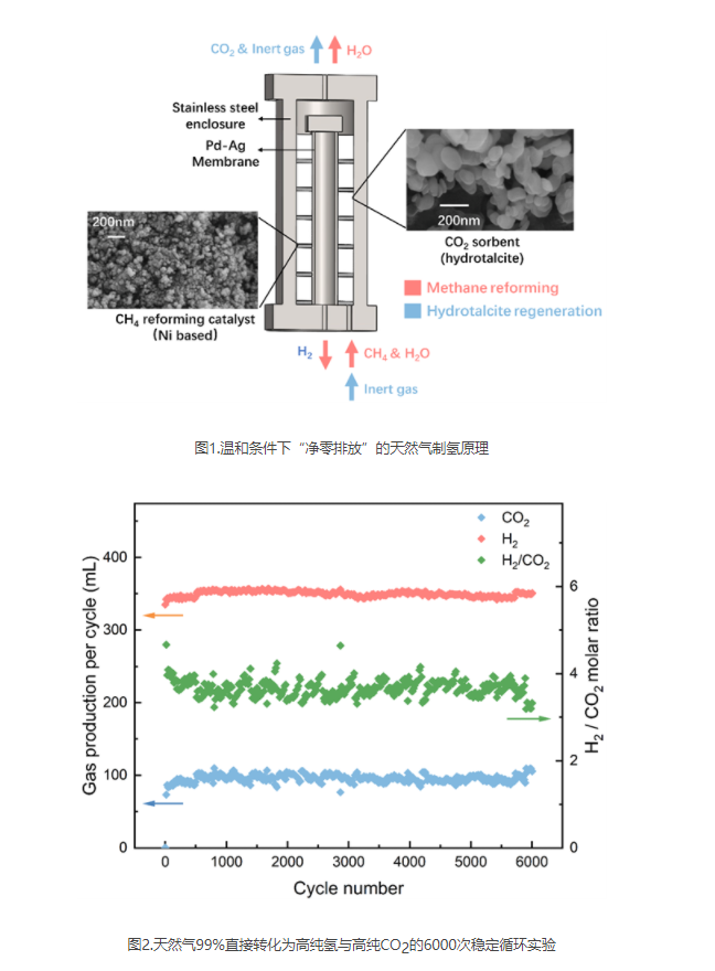 中國科學(xué)院工程熱物理研究所首次實現(xiàn)了400°C溫和條件下“凈零排放”的天然氣制氫原理突破。通過有序分離氫氣和二氧化碳產(chǎn)物,天然氣制氫反應(yīng)溫度由傳統(tǒng)的800-1000°C降至400°C以下,實現(xiàn)了99%以上甲烷直接轉(zhuǎn)化為高純氫與高純二氧化碳,并實現(xiàn)了基于化石能源的制氫與脫碳的完全協(xié)同。制氫與脫碳能耗下降幅度達(dá)20-40%?;诖耍摴ぷ鹘Y(jié)合商業(yè)化中溫槽式聚光技術(shù),實現(xiàn)了太陽能驅(qū)動的天然氣制氫與脫碳,進(jìn)一步減少化石能源制氫的碳足跡,展示了化石能源與可再生能源互補(bǔ)實現(xiàn)可持續(xù)氫能利用的可行性。反應(yīng)溫度的降低使工業(yè)余熱與氫能的結(jié)合成為可能。迄今為止,研究人員已完成了超過6000次的穩(wěn)定循環(huán)實驗,驗證了該方法的可靠性,并初步展示了技術(shù)轉(zhuǎn)化應(yīng)用的廣闊前景。