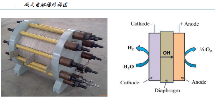 堿性電解技術(shù)成熟,單臺(tái)裝置規(guī)??蛇_(dá)1000Nm³/h以上,系統(tǒng)壽命長,成本較低,易于實(shí)現(xiàn)大規(guī)模應(yīng)用,是目前主流電解技術(shù)。其工作原理為:在電流作用下,水通過電化學(xué)反應(yīng)分解為氫氣和氧氣,并在電解池的陰極和陽極析出。水是弱電解質(zhì),需增強(qiáng)其導(dǎo)電能力,因此通常在水中加入NaOH、KOH等堿類物質(zhì)形成堿性電解質(zhì)。