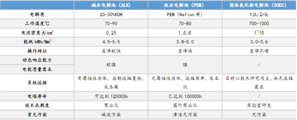 電解水制氫主流技術(shù)包括堿性電解、質(zhì)子交換膜(PEM)電解與固體氧化物(SOEC)電解,其中,堿性電解已大規(guī)模應(yīng)用,PEM電解則處于小規(guī)模應(yīng)用階段,SOEC電解尚處實(shí)驗(yàn)室階段,未商業(yè)化。