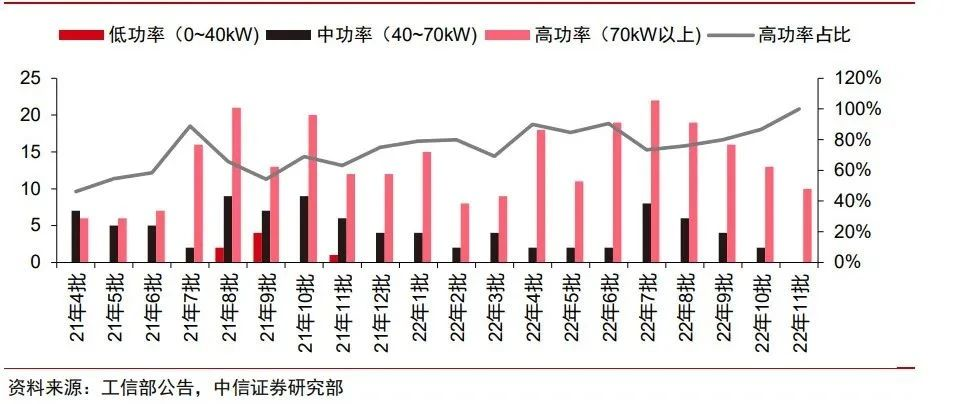 入圍車型延續(xù)了高功率化的趨勢。車型結(jié)構(gòu)方面,根據(jù)中信保上險量數(shù)據(jù),顯示2022年1~11月客車占比從1月的83%逐漸縮減到11月的9%,重卡占比從1月的9%逐漸增加到11月的51%,并且2022年1~3Q重卡主要在氫能源較為豐富的地區(qū)推廣,我們認為重卡有望繼續(xù)保持主導地位并率先實現(xiàn)經(jīng)濟性。