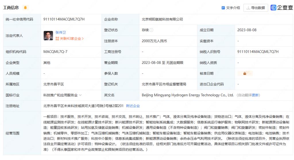 據(jù)企查查顯示,8 月 8 日,北京明陽氫能科技有限公司注冊成立,該公司注冊資本 2000 萬元,由風(fēng)電龍頭企業(yè)明陽集團(tuán)、祿順有限公司(LUCKY PROSPERITY COMPANY LIMITED)、北京永氫宏企業(yè)管理中心 ( 有限合伙 ) 等多家單位共同持股,其中明陽集團(tuán)持有 55% 股份、為最大股東,明陽集團(tuán)董事長張傳衛(wèi)擔(dān)任該公司法定代表人。