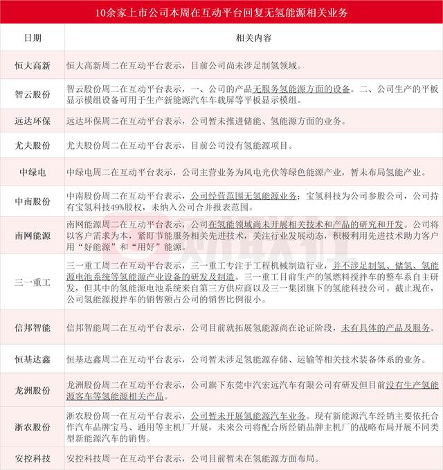 據(jù)財(cái)聯(lián)社不完全統(tǒng)計(jì),恒大高新、智云股份、遠(yuǎn)達(dá)環(huán)保、尤夫股份、中綠電、中南股份、南網(wǎng)能源、三一重工、信邦智能、恒基達(dá)鑫、龍洲股份、浙農(nóng)股份和安控科技在內(nèi)的13家上市公司本周在互動平臺無氫能源相關(guān)業(yè)務(wù)。具體情況如下圖: