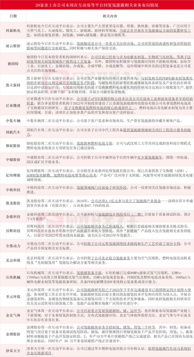據(jù)財(cái)聯(lián)社不完全統(tǒng)計(jì),科新機(jī)電、凌云股份、德固特、凱立新材、泛亞微透、中集車輛、國機(jī)汽車、駱駝股份、中儲股份、億緯鋰能、中核科技、凱龍股份、金能科技、昇輝科技、全柴動力、北京科銳、石化機(jī)械、圣元環(huán)保、金宏氣體、金博股份和津榮天宇在內(nèi)的21家上市公司本周在互動易等平臺回復(fù)氫能源相關(guān)業(yè)務(wù)情況。其中,德固特今日發(fā)布投資者機(jī)構(gòu)調(diào)研時(shí)表示,公司目前已經(jīng)參與并為制氫領(lǐng)域客戶提供過工藝裝備。凱立新材今日在互動平臺表示,公司在氫產(chǎn)業(yè)鏈布局的項(xiàng)目進(jìn)展具體為:與制氫相關(guān)的PEM電解水制氫催化劑的在研項(xiàng)目達(dá)到完成百克級穩(wěn)定生產(chǎn)階段。具體情況如下圖: