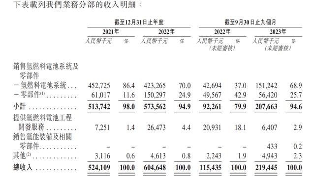 目前,重塑能源主要收入來源為銷售氫燃料電池及零部件,報告期內(nèi)收入占比均超九成。