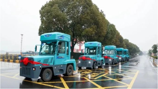 在張家港港務(wù)集團(tuán)港埠分公司倉庫內(nèi),5臺(tái)氫燃料港口專用牽引車一字排開,整齊壯觀。這些牽引車長3.8米、寬2米、高3米,屬于非道路移動(dòng)機(jī)械,主要用于港區(qū)內(nèi)件雜貨水平運(yùn)輸作業(yè)。它們的最大牽引載重量可達(dá)60噸,在氫瓶充滿的情況下可至少連續(xù)運(yùn)行8小時(shí),還擁有噪音低、操作舒適等特點(diǎn),其排放物為純凈水并采用一鍵自動(dòng)排水設(shè)計(jì)。