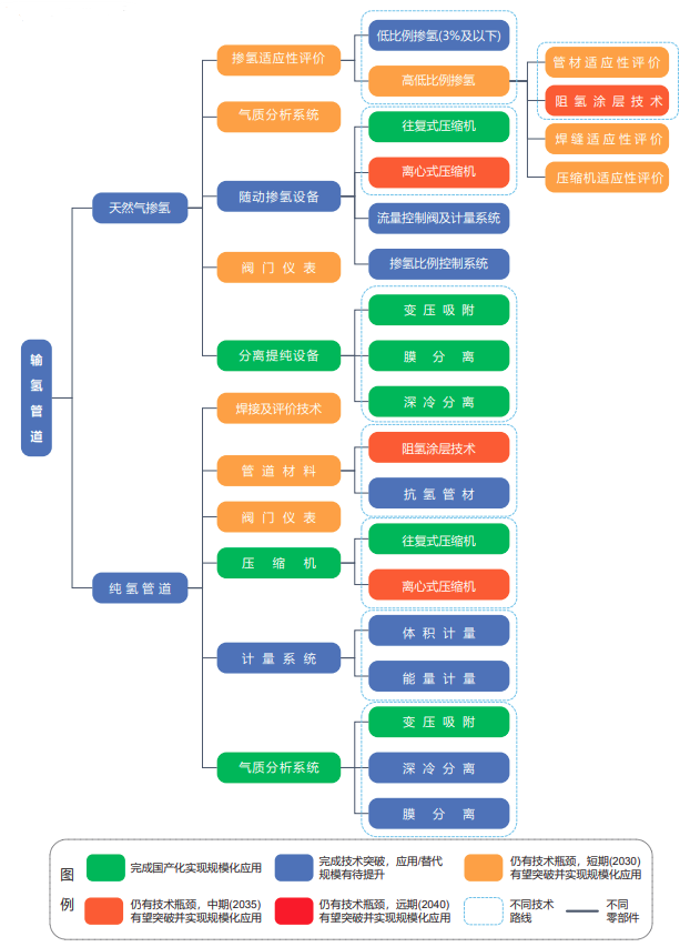 在高壓輸氫管道材料開發(fā)方面,高鋼級抗氫管材及阻氫涂層技術是當前管材開發(fā)的重點,可顯著提高管道的輸氫能力,國內預計在2030年左右取得突破并進入試用階段。