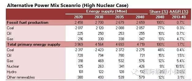 在大大提高能效的情境下,2040年一次能源供應(yīng)只有38.78億噸標(biāo)油,其中煤炭仍占48%、石油16%、天然氣11%、核電6%、水電3%、非水可再生能源14%。從發(fā)電量來(lái)看,2040年總裝機(jī)達(dá)2665吉瓦,發(fā)電量達(dá)9.39萬(wàn)億千瓦時(shí),煤電占51%、天然氣發(fā)電6%、核電10%、水電16%、風(fēng)電 10%、光伏4%、生物質(zhì)4%。