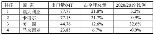 2020年LNG生產國共計出口356.12MT,2020年LNG出口最多的前4位國家如表。表明最大出口國是澳大利亞和卡塔爾,但增幅美國最大。