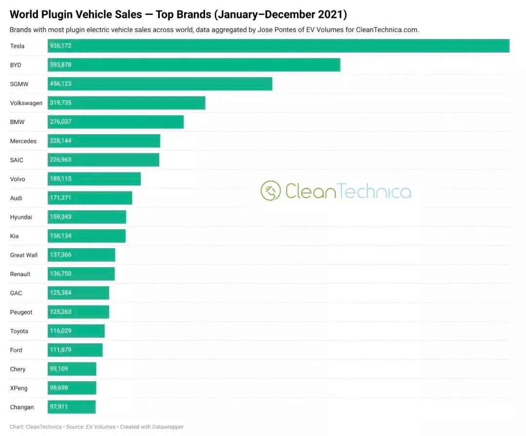 2021年全球新能源品牌銷量榜單火熱出爐。據(jù)CleanTechnica網(wǎng)站公布的2021年全球新能源品牌銷量數(shù)據(jù)顯示,2021年全球新能源車型累計銷量近650萬輛,較去年同期增長108%,其中TOP20品牌銷量476.34萬輛,占全球銷量的73.3%。