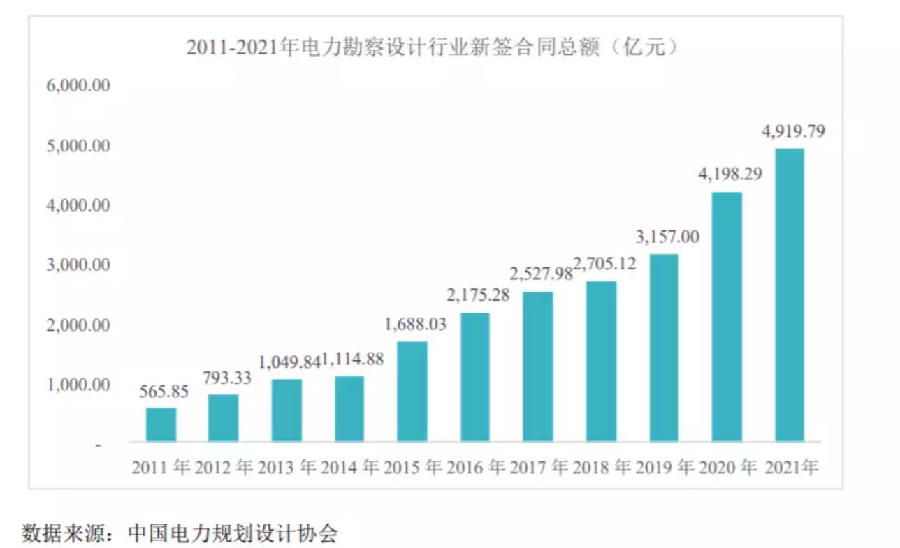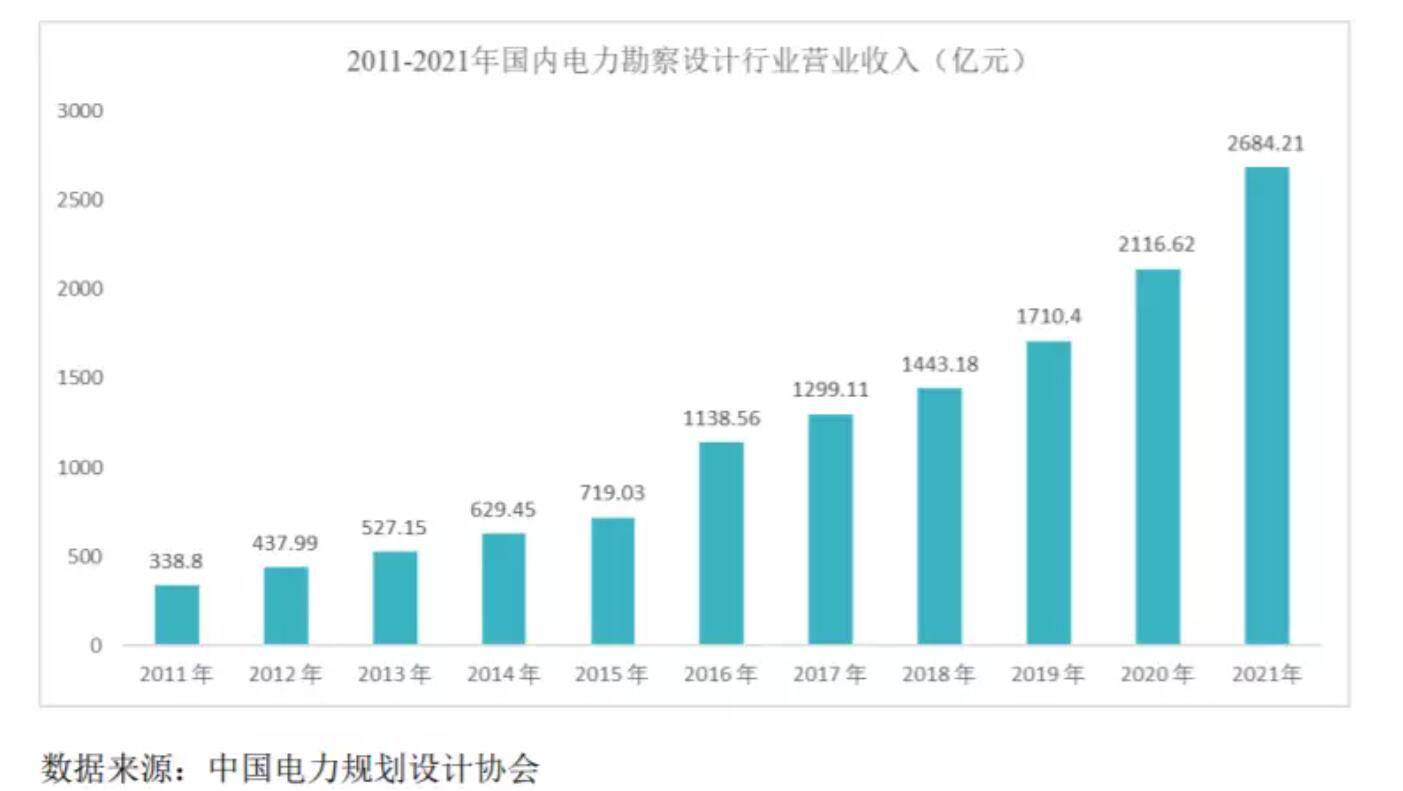 招股書(shū)顯示,根據(jù)中國(guó)電力規(guī)劃設(shè)計(jì)協(xié)會(huì)發(fā)布的電力勘察設(shè)計(jì)行業(yè)各年度統(tǒng)計(jì)數(shù)據(jù)顯示,2021年,電力勘察設(shè)計(jì)行業(yè)實(shí)現(xiàn)營(yíng)業(yè)收入2,684.21億元,同比增長(zhǎng)26.82%。