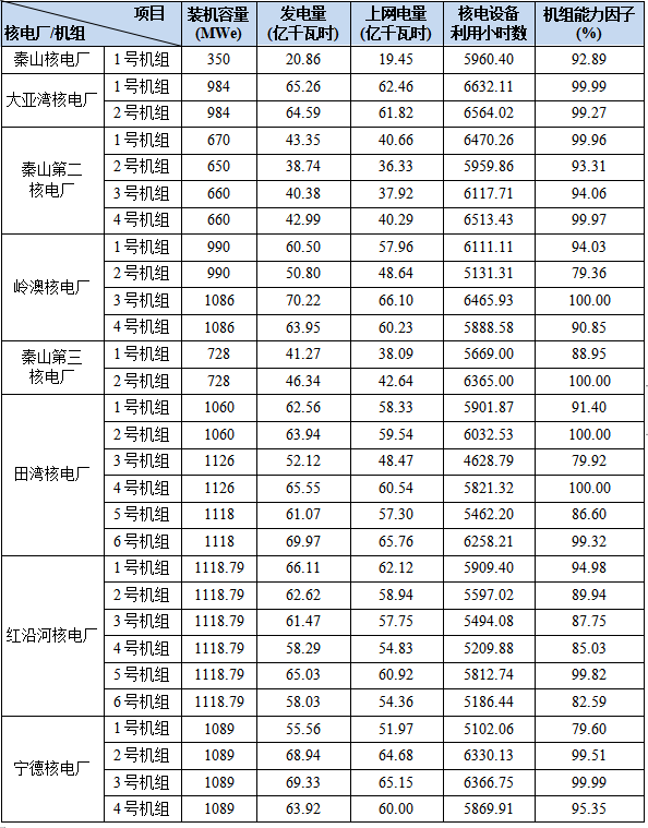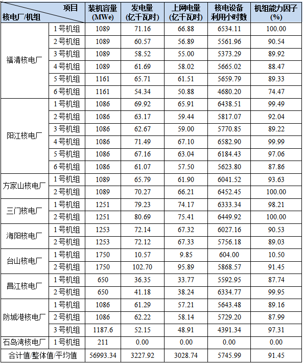3)本表“合計值/整體值/平均值”中,裝機容量、發(fā)電量、上網(wǎng)電量為各機組合計值,核電設(shè)備利用小時數(shù)為全部機組整體值,機組能力因子為全部參與統(tǒng)計的機組的算數(shù)平均值。
