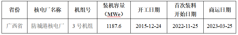 1)防城港核電廠3號機組2023年3月25日商運,機組2023年調(diào)試期間累計發(fā)電量、上網(wǎng)電量分別為8.02413億度、7.47180億度。