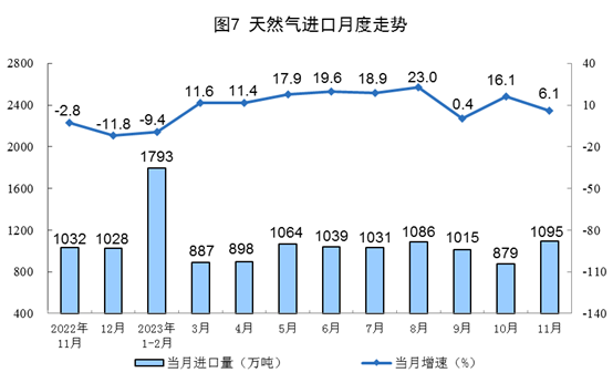 1—11月份,生產(chǎn)天然氣2096億立方米,同比增長(zhǎng)6.0%。進(jìn)口天然氣10740萬噸,同比增長(zhǎng)8.5%。