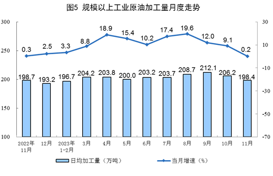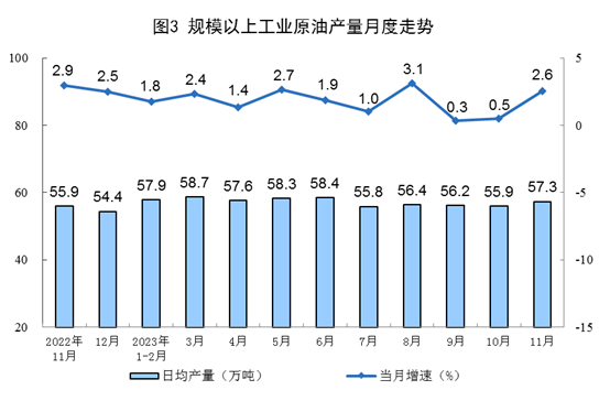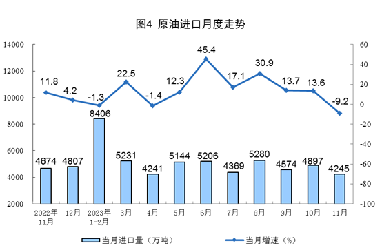 原油生產(chǎn)增速加快,進(jìn)口增速由增轉(zhuǎn)降。11月份,生產(chǎn)原油1720萬噸,同比增長(zhǎng)2.6%,增速比10月份加快2.1個(gè)百分點(diǎn),日均產(chǎn)量57.3萬噸。進(jìn)口原油4245萬噸,同比下降9.2%,10月份為增長(zhǎng)13.6%。