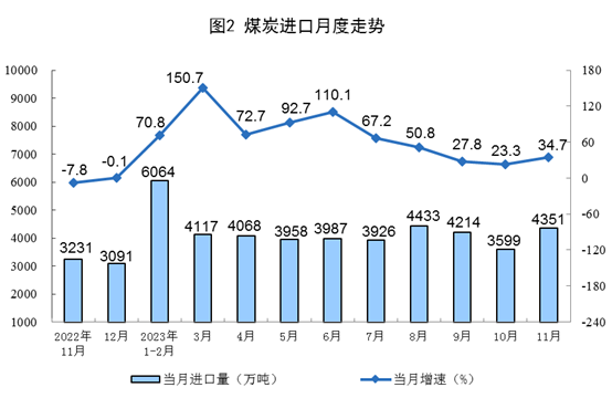 原煤生產(chǎn)有所加快,進(jìn)口較快增長(zhǎng)。11月份,生產(chǎn)原煤4.1億噸,同比增長(zhǎng)4.6%,增速比10月份加快0.8個(gè)百分點(diǎn),日均產(chǎn)量1379.9萬噸。進(jìn)口煤炭4351萬噸,同比增長(zhǎng)34.7%,增速比10月份加快11.4個(gè)百分點(diǎn)。