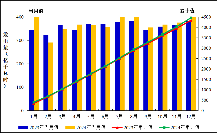 圖2:2023年1月至2024年12月全國(guó)運(yùn)行核電機(jī)組發(fā)電量趨勢(shì)
