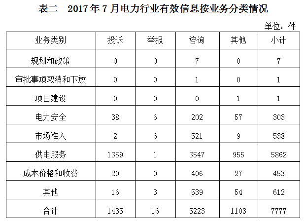 2017年7月收到的有效信息中,電力行業(yè)類(lèi)7777件,占88.26%;新能源和可再生能源行業(yè)類(lèi)494件,占5.61%;石油天然氣行業(yè)類(lèi)20件,占0.23%;煤炭行業(yè)類(lèi)2件,占0.02%;其他事項(xiàng)518件,占5.88%。