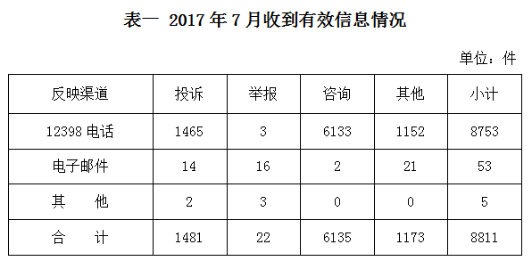 按反映渠道分類(lèi),12398電話8753件,電子郵件53件,其他5件。(2017年7月收到有效信息情況見(jiàn)表一)