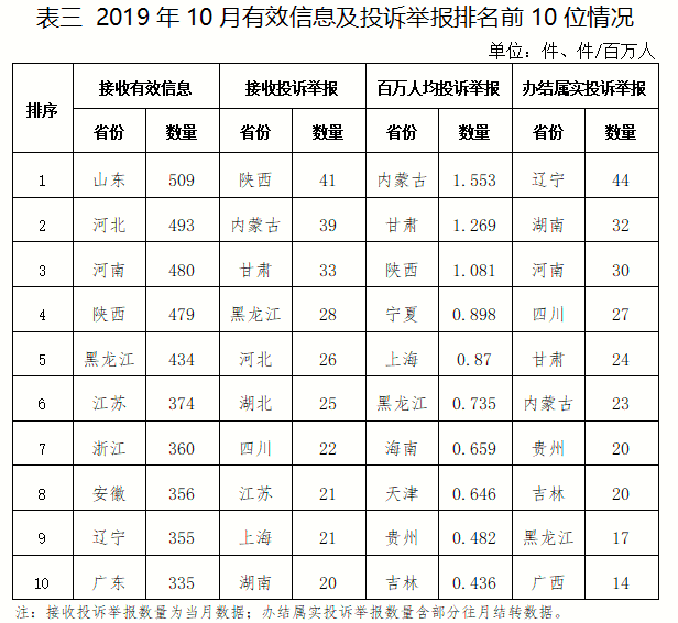 各省(自治區(qū)、直轄市)按照收到的有效信息數(shù)量排序,山東、河北、河南、陜西、黑龍江等列全國前10位;按照投訴舉報(bào)數(shù)量排序,陜西、內(nèi)蒙古、甘肅、黑龍江、河北等排在全國前10位;按照百萬人均投訴舉報(bào)數(shù)量排序,內(nèi)蒙古、甘肅、陜西、寧夏、上海等排在全國前10位;按照辦結(jié)屬實(shí)投訴舉報(bào)數(shù)量排序,遼寧、湖南、河南、四川、甘肅等排在全國前10位。(2019年10月有效信息及投訴舉報(bào)排名前10位情況見表三)