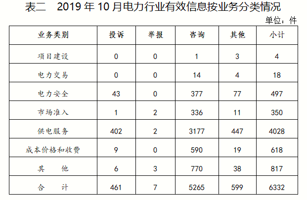電力行業(yè)排在首位,有效信息數(shù)量為6332件,占全部有效信息的78.64%;其中受理的投訴舉報(bào)數(shù)量為449件,占全部投訴舉報(bào)數(shù)量的92%。群眾反映的問題主要集中在供電服務(wù)、電力安全、成本價(jià)格和收費(fèi)等方面。(2019年10月電力行業(yè)有效信息按業(yè)務(wù)分類情況見表二)