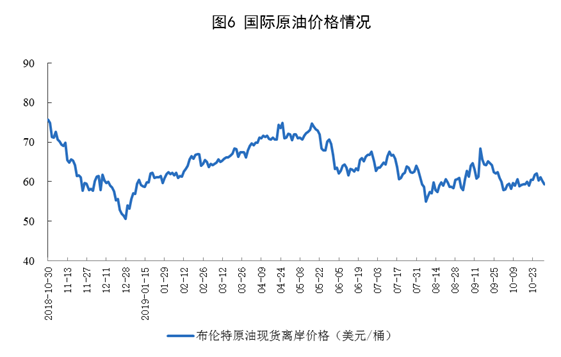10月份,國際原油價(jià)格震蕩下跌,10月31日布倫特原油現(xiàn)貨離岸價(jià)格為59.3美元/桶,比9月30日下降1.69美元。