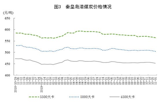 煤炭價(jià)格小幅下跌。11月1日,秦皇島港5500大卡、5000大卡和4500大卡煤炭綜合交易價(jià)格分別為每噸565元、505元和453元,比9月底分別回落5元、4元和3元。