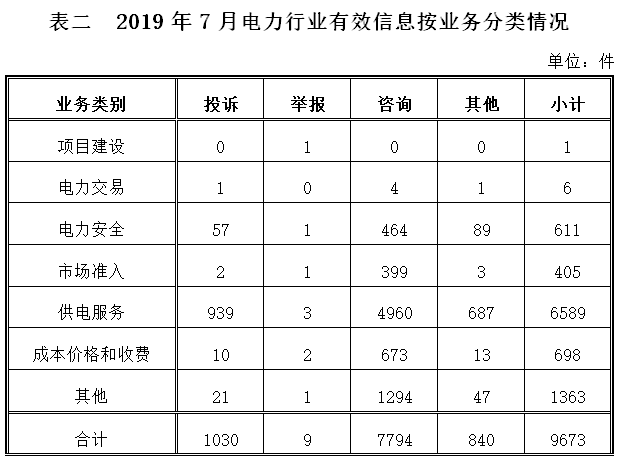 電力行業(yè)排在首位,有效信息數(shù)量為9673件,占全部有效信息的82.92%;其中受理的投訴舉報數(shù)量為1039件,占全部投訴舉報數(shù)量的96.38%。群眾反映的問題主要集中在供電服務(wù)、電力安全、成本價格和收費等方面。(2019年7月電力行業(yè)有效信息按業(yè)務(wù)分類情況見表二)