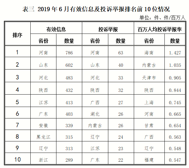各省(自治區(qū)、直轄市)按照收到的有效信息數(shù)量排序,河南、山東、河北、陜西、江蘇等列全國(guó)前10位;按照投訴舉報(bào)數(shù)量排序,河南、山東、河北、陜西、廣西等排在全國(guó)前10位。按照百萬(wàn)人均投訴舉報(bào)數(shù)量排序,海南、內(nèi)蒙古、天津、陜西、上海等排在全國(guó)前10位。(2019年6月有效信息及投訴舉報(bào)排名前10位情況見(jiàn)表三)