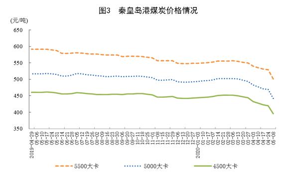 煤炭進(jìn)口增長較快,交易價(jià)格有所下跌。4月份,進(jìn)口煤炭3095萬噸,同比增長22.3%;1—4月份,進(jìn)口煤炭1.3億噸,同比增長26.9%。港口煤炭綜合交易價(jià)格繼續(xù)下跌,5月8日秦皇島港5500、5000和4500大卡煤炭?jī)r(jià)格分別為每噸501元、442元和396元,比4月3日分別下跌39元、41元和36元。