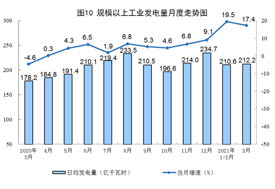 電力生產(chǎn)增長較快。3月份,發(fā)電6579億千瓦時,同比增長17.4%,比2019年3月份增長12.0%,兩年平均增長5.8%,日均發(fā)電212.2億千瓦時。一季度,發(fā)電19051億千瓦時,同比增長19.0%,比2019年一季度增長10.8%,兩年平均增長5.3%。