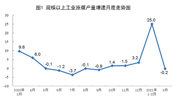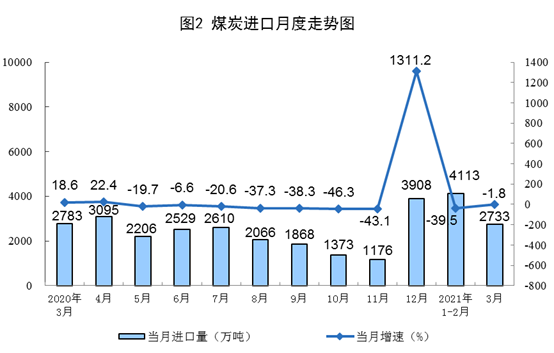 原煤生產(chǎn)小幅下降。3月份,生產(chǎn)原煤3.4億噸,同比下降0.2%,比2019年3月份增長9.4%,兩年平均增長4.6%,日均產(chǎn)量1099萬噸;進(jìn)口煤炭2733萬噸,同比下降1.8%。