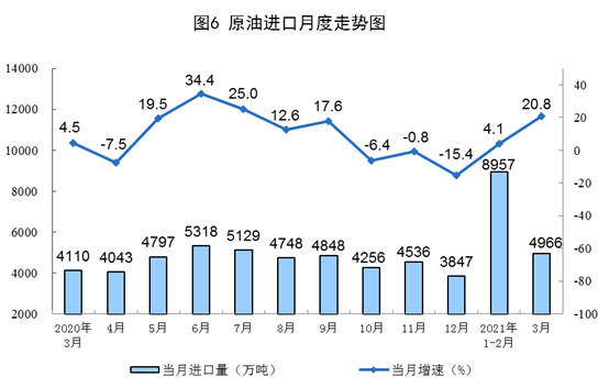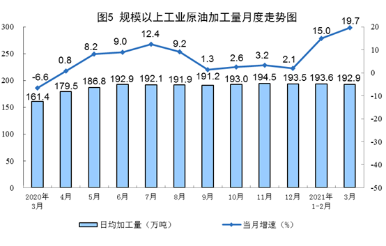 原油生產(chǎn)加快,加工量較快增長。3月份,生產(chǎn)原油1709萬噸,同比增長3.3%,比2019年3月份增長3.3%,兩年平均增長1.6%,日均產(chǎn)量55.1萬噸。加工原油5979萬噸,同比增長19.7%,比2019年3月份增長11.8%,兩年平均增長5.8%,日均加工192.9萬噸。