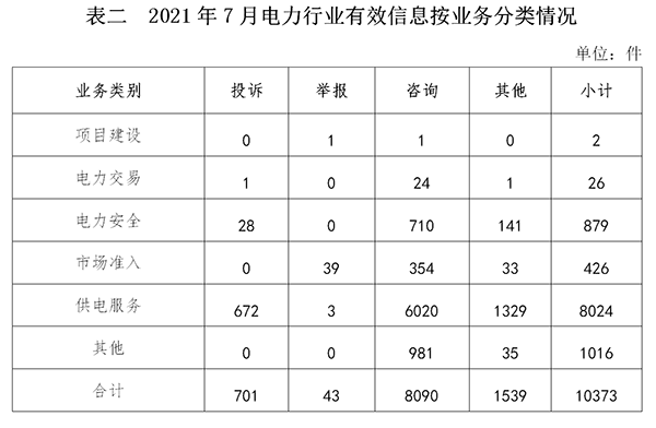 電力行業(yè)排在首位,有效信息數(shù)量為10373件,占全部有效信息的80.90%。群眾關(guān)注的內(nèi)容主要集中在故障停電、供電安全、電表計(jì)量咨詢等方面。(2021年7月電力行業(yè)有效信息按業(yè)務(wù)分類情況見表二)