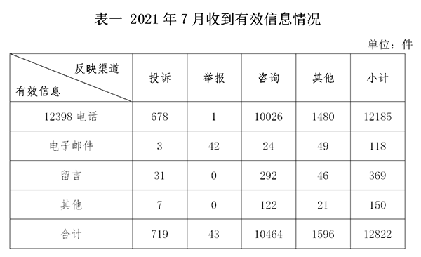 2021年7月,國(guó)家能源局12398能源監(jiān)管熱線(以下簡(jiǎn)稱12398熱線)共收到有效信息12822件(包含投訴、舉報(bào)、咨詢和其他訴求類別),環(huán)比增加29.52%,同比增加11.58%。(2021年7月收到有效信息情況見表一)