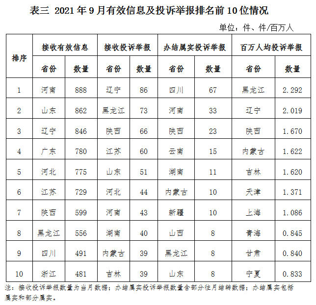 各省(自治區(qū)、直轄市)按照接收的有效信息數(shù)量排序,河南、山東、遼寧、廣東、河北、江蘇、陜西、黑龍江、四川、浙江列全國(guó)前10位;按照接收的投訴舉報(bào)數(shù)量排序,遼寧、黑龍江、陜西、江蘇、山東、河北、河南、湖南、內(nèi)蒙古、吉林排在全國(guó)前10位;按照辦結(jié)屬實(shí)的投訴舉報(bào)數(shù)量排序,四川、河南、陜西、云南、湖南、內(nèi)蒙古、新疆、山西、黑龍江、山東排在全國(guó)前10位;按照百萬(wàn)人均投訴舉報(bào)數(shù)量排序,黑龍江、遼寧、陜西、內(nèi)蒙古、吉林、天津、上海、青海、甘肅、寧夏排在全國(guó)前10位。(2021年9月有效信息及投訴舉報(bào)排名前10位情況見(jiàn)表三)