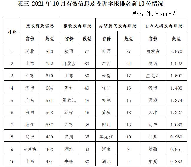各省(自治區(qū)、直轄市)按照接收的有效信息數(shù)量排序,河北、山東、江蘇、河南、廣東、陜西、浙江、遼寧、內(nèi)蒙古、山西列全國前10位;按照接收的投訴舉報數(shù)量排序,陜西、內(nèi)蒙古、山東、河北、黑龍江、遼寧、江蘇、四川、湖北、安徽排在全國前10位;按照辦結屬實的投訴舉報數(shù)量排序,陜西、廣西、云南、遼寧、吉林、重慶、四川、黑龍江、河南、湖北排在全國前10位;按照百萬人均投訴舉報數(shù)量排序,內(nèi)蒙古、陜西、黑龍江、海南、西藏、天津、遼寧、甘肅、新疆、寧夏排在全國前10位。(2021年10月有效信息及投訴舉報排名前10位情況見表三)