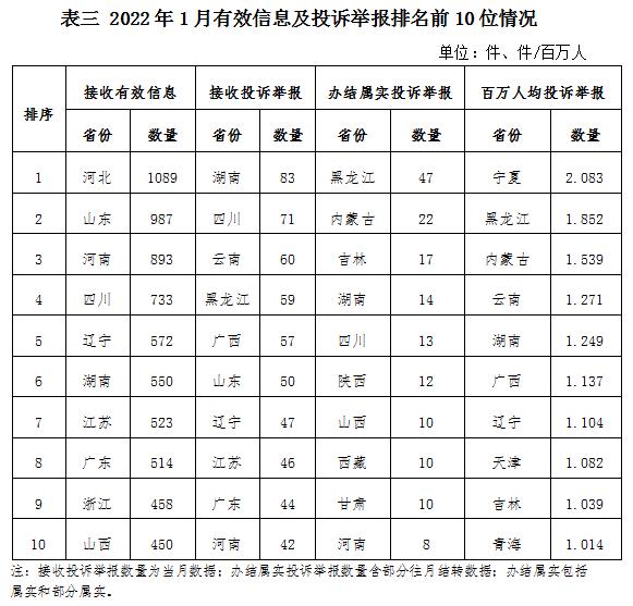 各省(自治區(qū)、直轄市)按照接收的有效信息數(shù)量排序,河北、山東、河南、四川、遼寧、湖南、江蘇、廣東、浙江、山西排在全國前10位;按照接收的投訴舉報數(shù)量排序,湖南、四川、云南、黑龍江、廣西、山東、遼寧、江蘇、廣東、河南排在全國前10位;按照辦結屬實的投訴舉報數(shù)量排序,黑龍江、內(nèi)蒙古、吉林、湖南、四川、陜西、山西、西藏、甘肅、河南排在全國前10位;按照百萬人均投訴舉報數(shù)量排序,寧夏、黑龍江、內(nèi)蒙古、云南、湖南、廣西、遼寧、天津、吉林、青海排在全國前10位。(2022年1月有效信息及投訴舉報排名前10位情況見表三)