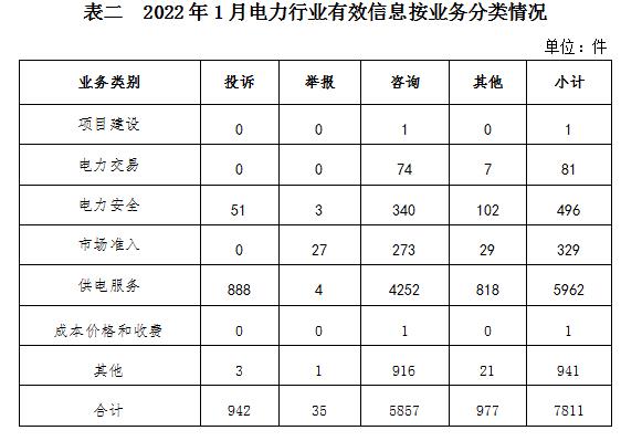 電力行業(yè)排在首位,有效信息數(shù)量為7811件,占全部有效信息的64.71%。群眾關注的內(nèi)容主要集中在故障停電、供電安全、電費計量和收繳等方面。(2022年1月電力行業(yè)有效信息按業(yè)務分類情況見表二)
