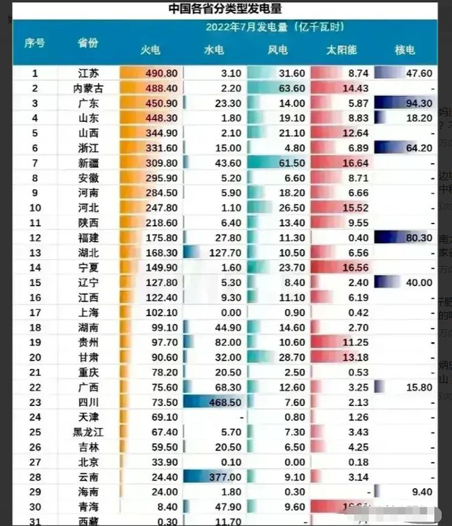 2022年7月全國(guó)各省火力發(fā)電量:江蘇省以490.8億千瓦時(shí)位居第一,寧夏接近湖北,四川僅第23。