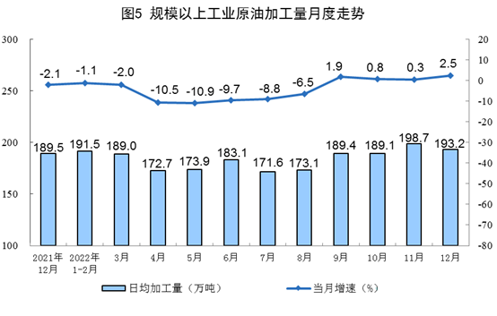 原油加工增速有所加快。12月份,加工原油5988萬噸,同比增長2.5%,增速比上月加快2.2個百分點,日均加工193.2萬噸。2022年,加工原油67590萬噸,同比下降3.4%。