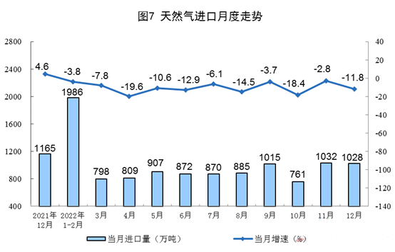 2022年,生產(chǎn)天然氣2178億立方米,同比增長6.4%。進口天然氣10925萬噸,同比下降9.9%。