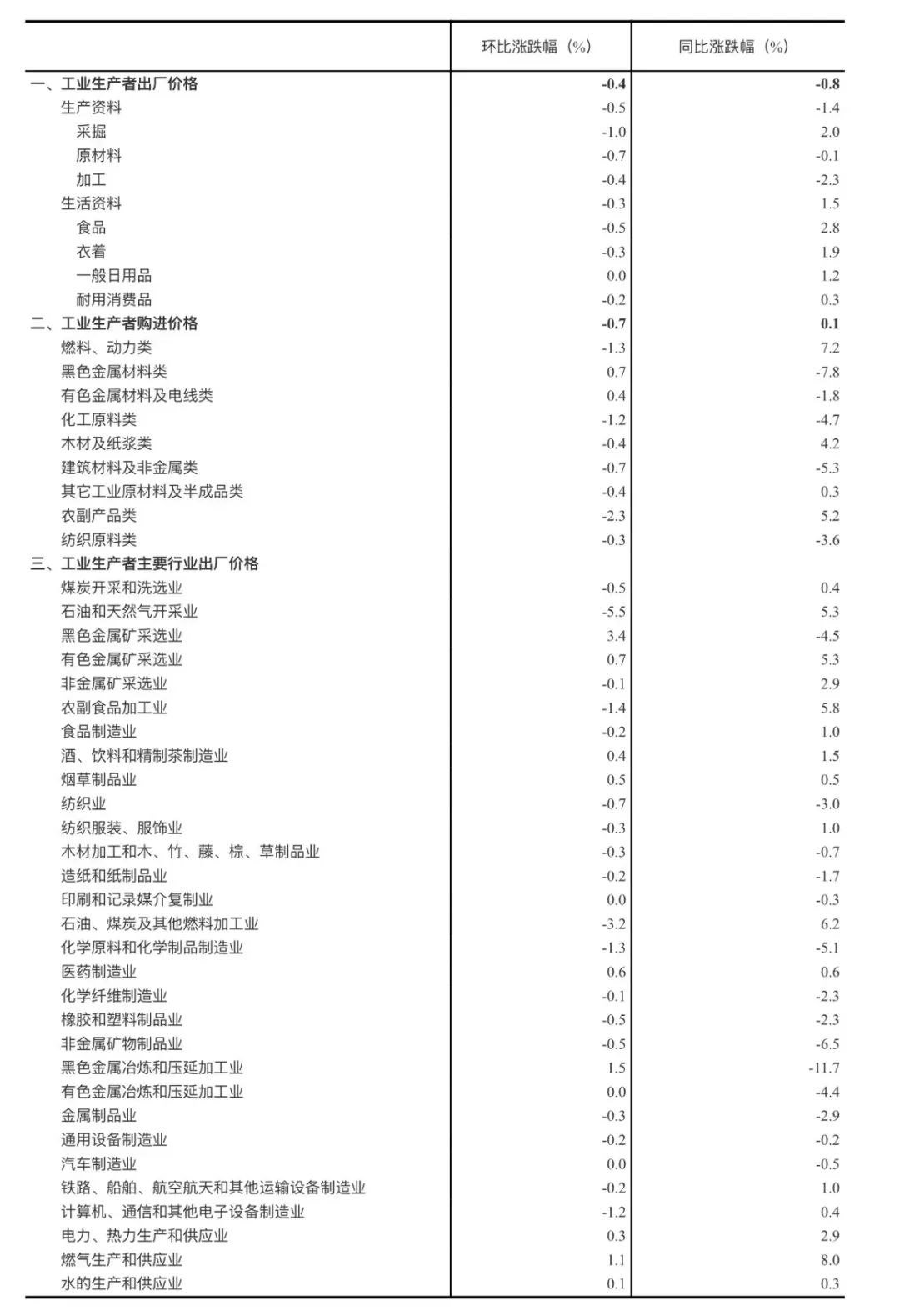 工業(yè)生產(chǎn)者出廠價(jià)格中,生產(chǎn)資料價(jià)格下降0.5%,影響工業(yè)生產(chǎn)者出廠價(jià)格總水平下降約0.38個(gè)百分點(diǎn)。其中,采掘工業(yè)價(jià)格下降1.0%,原材料工業(yè)價(jià)格下降0.7%,加工工業(yè)價(jià)格下降0.4%。生活資料價(jià)格下降0.3%,影響工業(yè)生產(chǎn)者出廠價(jià)格總水平下降約0.06個(gè)百分點(diǎn)。其中,食品價(jià)格下降0.5%,衣著價(jià)格下降0.3%,一般日用品價(jià)格持平,耐用消費(fèi)品價(jià)格下降0.2%。