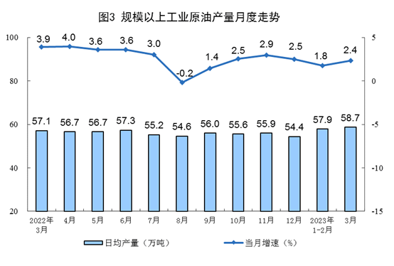 原油生產(chǎn)略有加快,進(jìn)口由降轉(zhuǎn)增。3月份,生產(chǎn)原油1818萬噸,同比增長2.4%,增速比1—2月份加快0.6個(gè)百分點(diǎn),日均產(chǎn)量58.7萬噸。進(jìn)口原油5231萬噸,同比增長22.5%,1—2月份為下降1.3%。