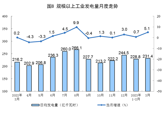 電力生產(chǎn)增速加快。3月份,發(fā)電7173億千瓦時(shí),同比增長5.1%,增速比1—2月份加快4.4個(gè)百分點(diǎn),日均發(fā)電231.4億千瓦時(shí)。1—3月份,發(fā)電20712億千瓦時(shí),同比增長2.4%。