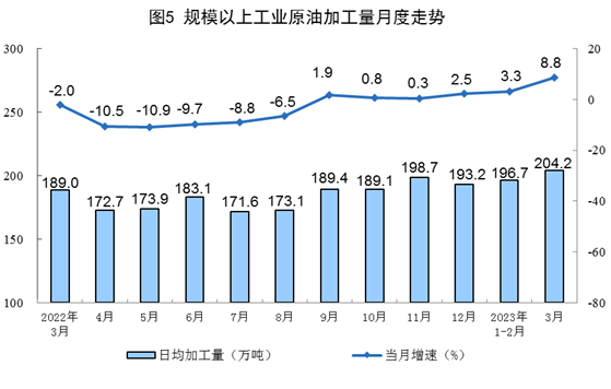 原油加工增速加快。3月份,加工原油6329萬噸,同比增長8.8%,增速比1—2月份加快5.5個(gè)百分點(diǎn),日均加工原油204.2萬噸。1—3月份,加工原油17926萬噸,同比增長5.2%。